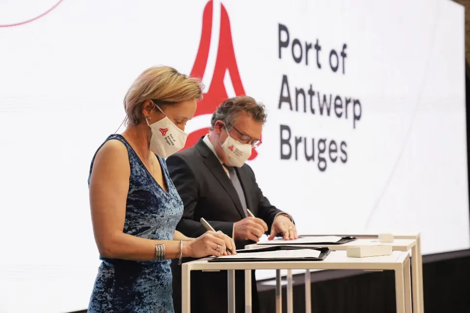 FOTO: Annick De Ridder, havenschepen en voorzitter van de raad van bestuur van het Antwerps Havenbedrijf, en Dirk De fauw, burgemeester van Brugge en voorzitter van het havenbestuur Zeebrugge, ondertekenen het akkoord tussen de 2 havens.