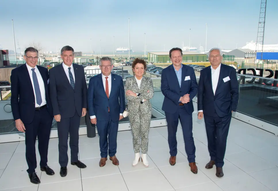FOTO: Michel Vanneuville, v.l.n.r.: Marc Adriansens, voorzitter Apzi-Voka; Jan Jambon, minister-president van de Vlaamse Regering; Dirk De fauw, burgemeester Stad Brugge & voorzitter Raad van Bestuur Port of Zeebrugge; Lydia Peeters, Vlaams minister van Mobiliteit en Openbare Werken; Tom Hautekiet, CEO Port of Zeebrugge; Ludo Lievens, bestuur Apzi-Voka