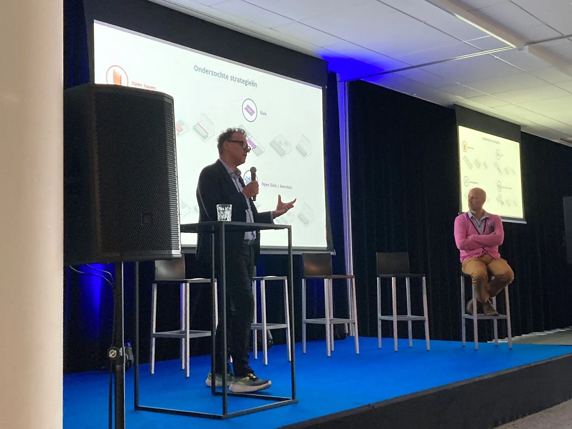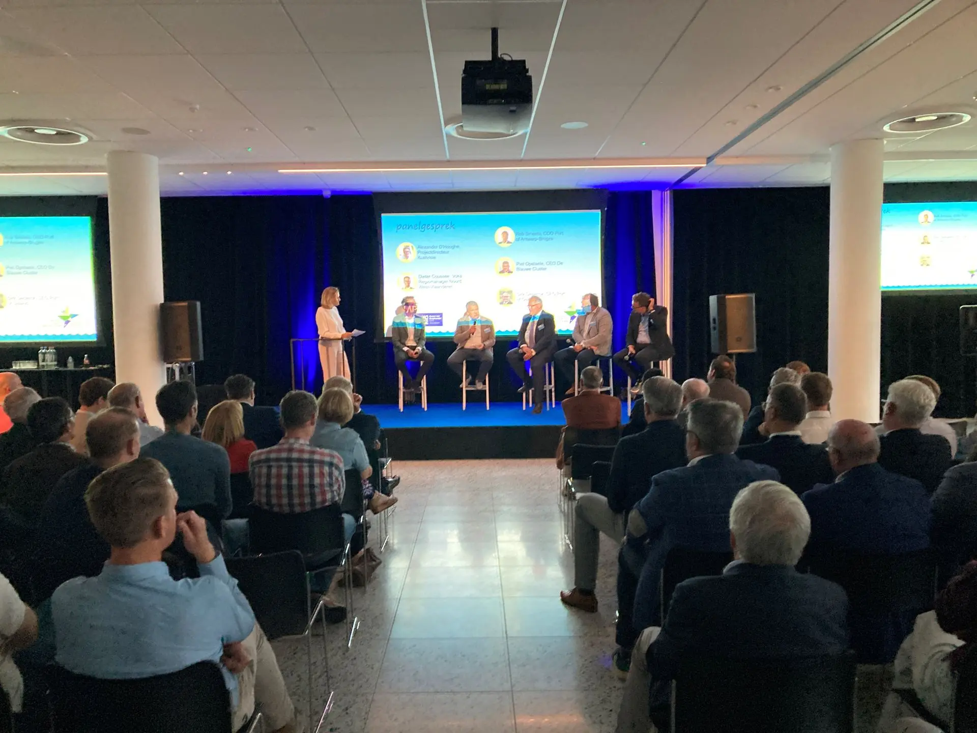 Tijdens het panelgesprek werd gedebatteerd over hoe we met Kustvisie niet enkel de bescherming van de mens kunnen waarborgen, maar ook de economische activiteit en ontwikkeling in de havens kunnen verzekeren. Er werd gepleit voor een totaalplan voor alle Vlaamse havens en om de verschillende uitdagingen samen aan te pakken. Ook innovatieve oplossingen werden geopperd, zoals drijvende, modulaire haveninstallaties, energie-eilanden op zee en ‘nature-based solutions’ om met glooiende natuurzones onze kust te beschermen. De gedachtewisseling bracht enkele boeiende inzichten naar boven en inspiratie voor alle betrokkenen.