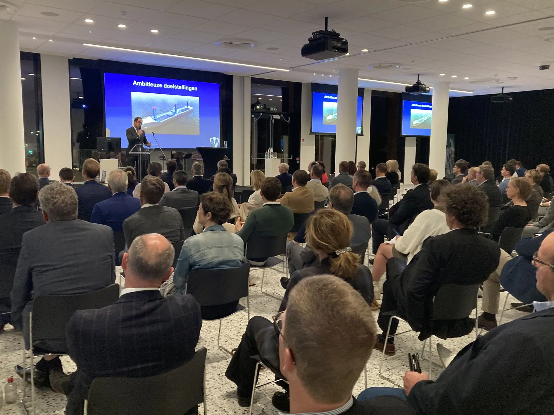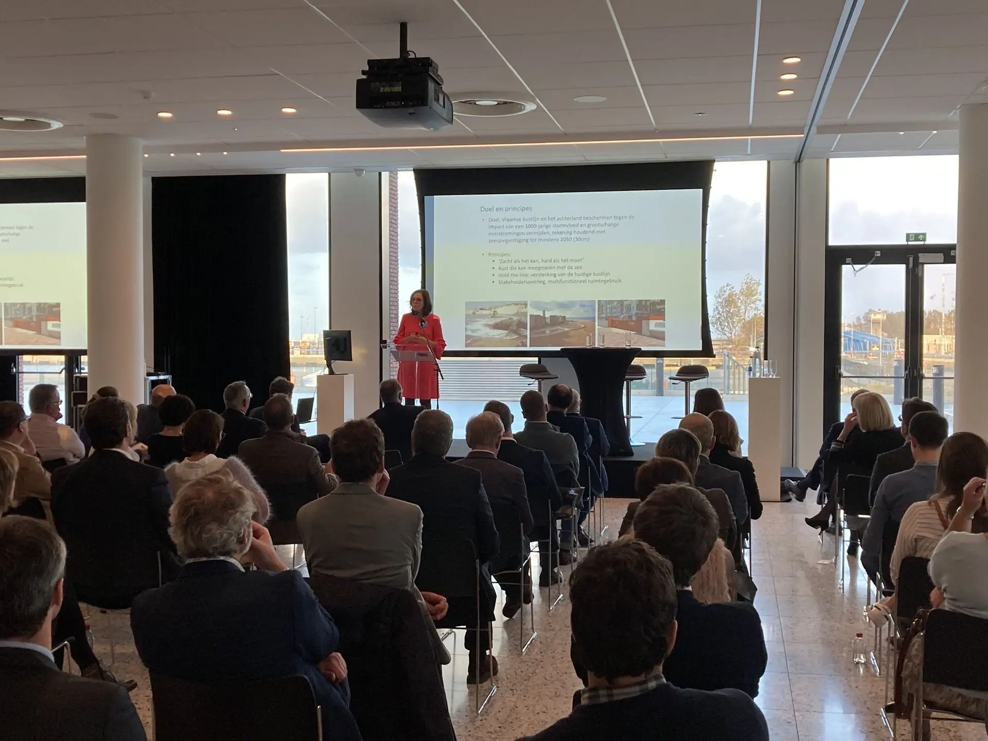 Naast deze centrale spreker mochten we nog luisteren naar enkele vooraanstaande gastsprekers op dit unieke havenevent. Vice-eerste minister en minister van Noordzee Vincent Van Quickenborne vertelde ons meer over de rol van de havens en de maritieme sector in de strijd tegen de klimaatverandering. Dr. Ir. Nathalie Balcaen bracht ons haar verhaal als administrateur-generaal van het Agentschap voor Maritieme Dienstverlening en Kust over de impact van de zeespiegelstijging op de maritieme sector en de beschermingsmaatregelen die genomen kunnen worden. Federaal minister voor Energie Tinne Van der Straeten kon helaas niet fysiek aanwezig zijn, maar bracht ons via een videoboodschap toch haar visie op de verdere transitie naar klimaatneutrale energie en welke rol de havens daarin kunnen spelen.