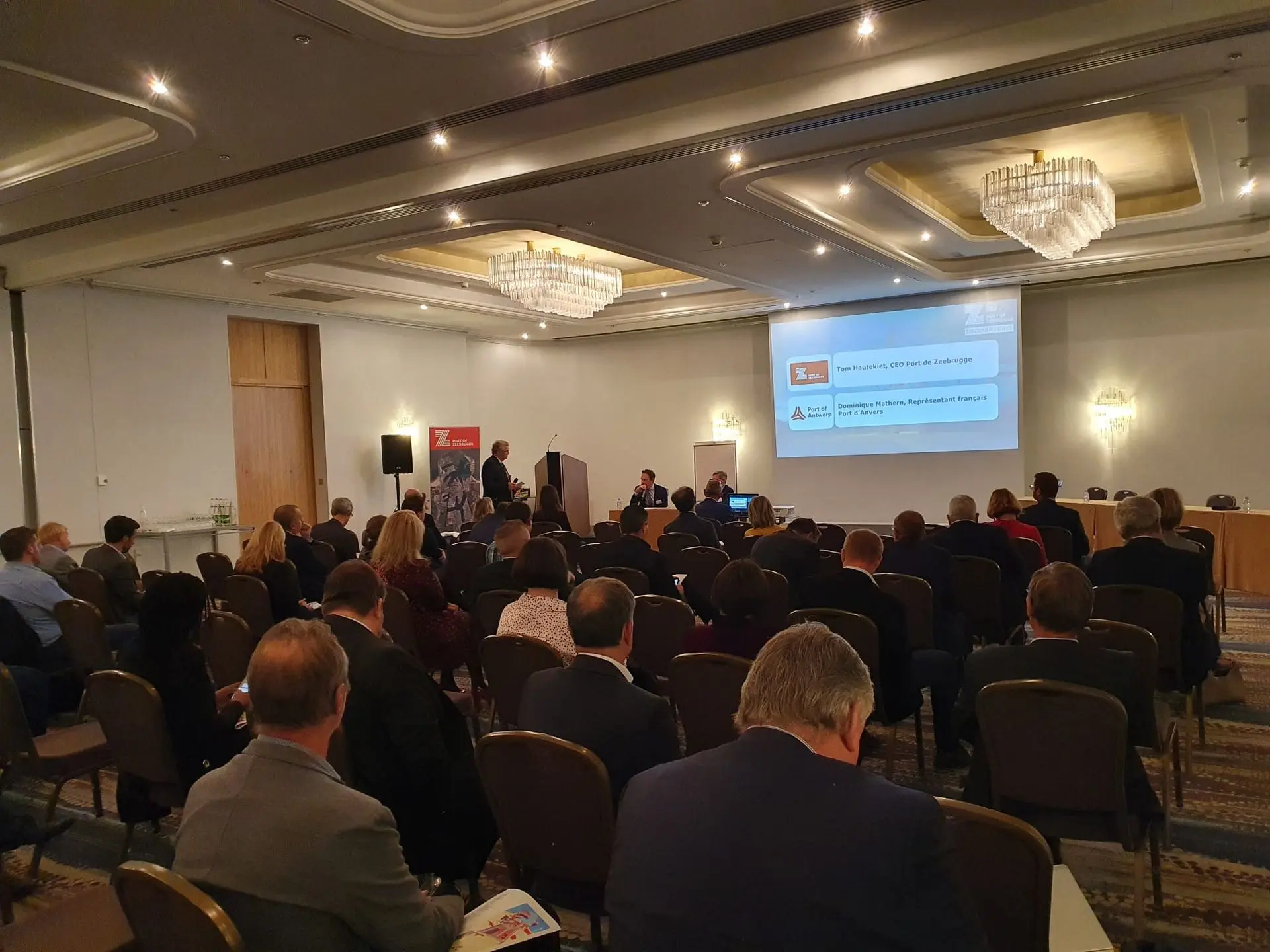 Tijdens het tweede panelgesprek stond de toekomst centraal. Tom Hautekiet en Dominique Mathern, vertegenwoordiger van Port of Antwerp in Frankrijk, gingen dieper in op de uitdagingen waar de haven van Zeebrugge mee te maken krijgt en de eenmaking met Port of Antwerp.